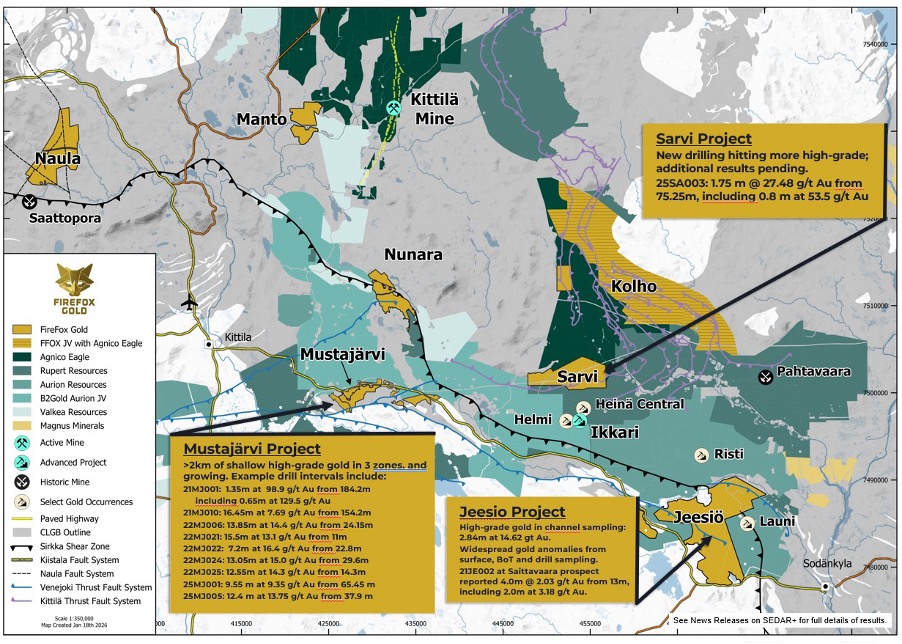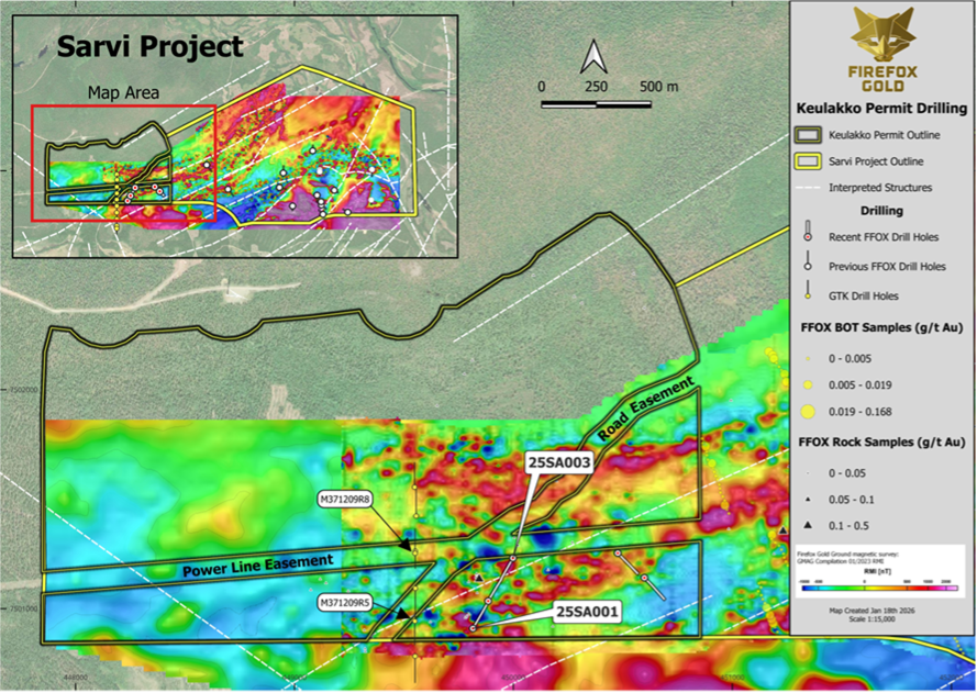 SODANKYLÄ, FINLAND – (January 21, 2026) – FireFox Gold Corp. (TSX.V: FFOX)(OTCQB: FFOXF)(“FireFox” or the “Company”) is pleased to report the first results from 2025 drilling into a new target at the western end of the Company’s 100%-held Sarvi gold project (“Sarvi”) in Lapland, Finland. Drill hole 25SA003 encountered a high-grade gold zone of 1.75 metres averaging 27.48 g/t, including 0.8 metres at 53.50 g/t gold, from 73.4 metres downhole depth. The target concept for this small reconnaissance drill program was to examine interpreted regional scale structures cutting through discrete magnetic highs and magnetic gradients (transitions from highly magnetic to less magnetic rocks). As previously reported, reconnaissance drilling by the Geological Survey of Finland (GTK) nearby encountered narrow intervals of moderate gold grade (See Company news release dated November 18, 2025).