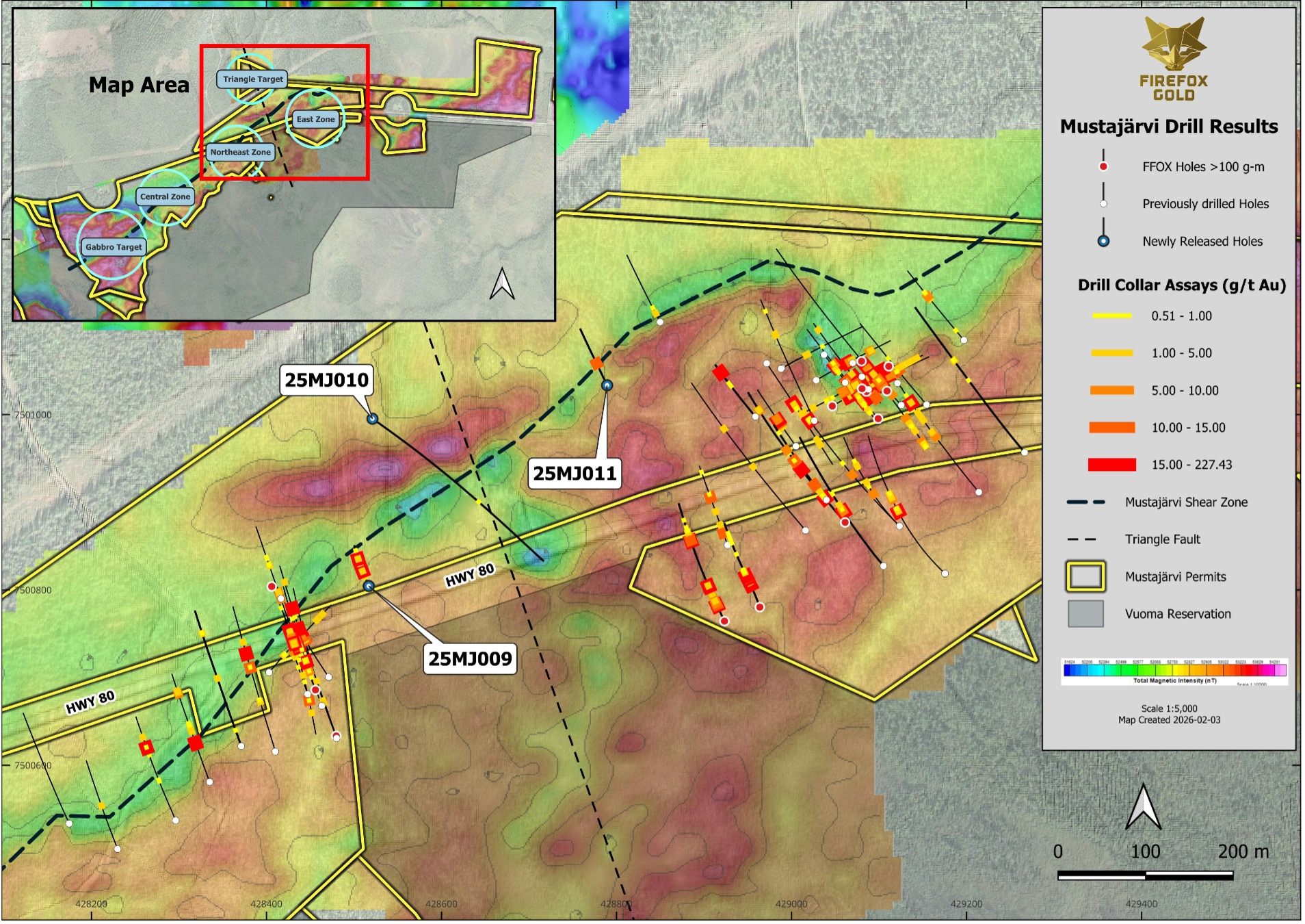 SODANKYLÄ, FINLAND – (February 9, 2026) – FireFox Gold Corp. (TSX.V: FFOX)(OTCQB: FFOXF)(“FireFox” or the “Company”) is pleased to report results from three additional holes of its 2025/26 diamond drilling program at the Company’s 100%-held Mustajärvi Gold Project (“Mustajärvi”or the “Project”) in Lapland, Finland. These holes generally come from the north side of the Northeast and East Zones. Drill hole 25MJ009 stepped out almost 100 metres from the high-grade intercepts at the Northeast Zone (NEZ) to test for continuation along the shear zone (see Figure 1). The hole intersected several high-grade gold-mineralized intervals, including: